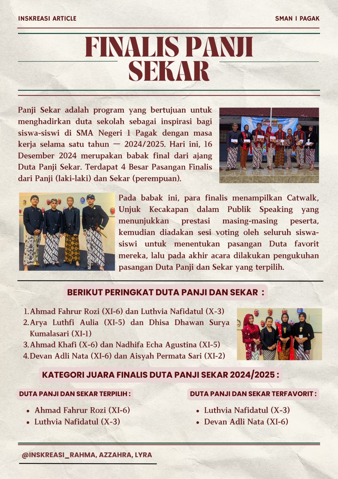 Pemilihan Duta Panji Sekar SMAN 1 Pagak telah usai dan para pemenang sudah ditentukan.