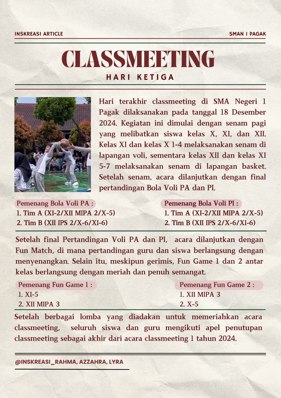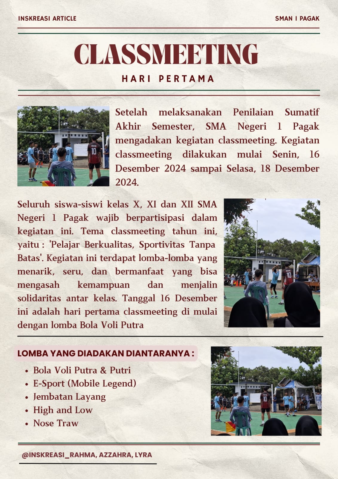 Classmeet yang ditunggu-tunggu tiba bagi siswa/siswi SMAN 1 Pagak. Berbagai kegiatan dilakukan yang ...